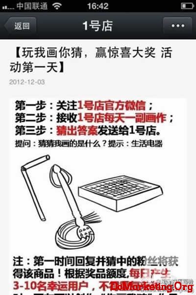 一号店搞的“我画你猜”微信营销活动。每天微信推送一个图画给用户,用户猜中后在微信上回复就可能中奖。