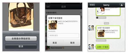 用户可以将美丽说中的内容分享到微信中,由于微信用户彼此间具有某种更加亲密的关系,所以当美丽说中的商品被某个用户分享给其他好友后,相当于完成了一个有效到达的口碑营销。