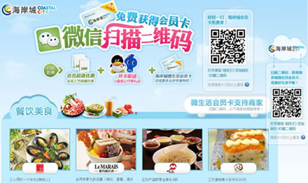 深圳大型商场海岸城推出“开启微信会员卡”活动,微信用户只要使用微信扫描海岸城专属二维码,即可免费获得海岸城手机会员卡,凭此享受海岸城内多家商户优惠特权。