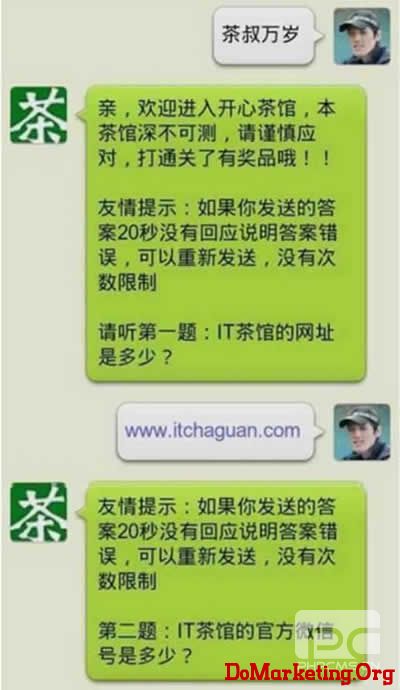 加“IT茶馆”为好友后,根据提示即可开始答题。回答对题目进入下一题,如果是第一位全部通关者,还有手机移动电源赠送。