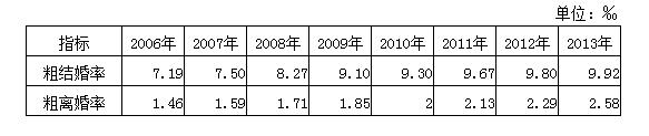 《公报》显示,2013年全国共有事业单位性质的婚姻登记机构2059个。各级民政部门和婚姻登记机构共依法办理结婚登记1346.9万对,比上年增长1.8%。其中:内地居民登记结婚1341.4万对,涉外及华侨、港澳台居民登记结婚5.5万对。粗结婚率为9.9‰,比上年上升0.1个千分点。2013年25-29岁办理结婚登记占结婚总人口比重最多,占35.2%,比上年提高1个百分点。