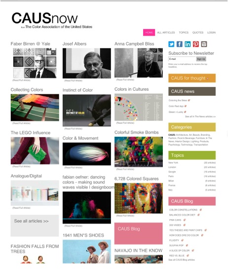 CAUS 的网站(CAUSnow) 的使命是讨论最新的色彩趋势,和成为色彩资源的终点站。在它的网站上策展的内容可以很广,但必须要包含一个色彩主题或运用鲜明的影像。因为受众的类别广泛,CAUSnow 要在相关网站上脱颖而出,提供一站式的与色彩相关的内容,尤其是可以“帮助受众作出与颜色相关的决策”的视觉性影像。透过内容策展,CAUS 总是走在潮流的前端。