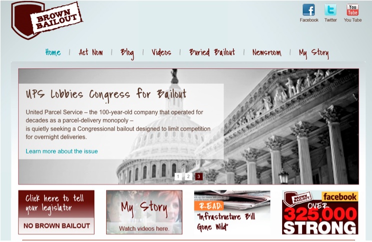 FedEx联邦快递在几年前建立了一个名为“Brown Bailout”的网站,提倡反对联邦航空管理局援助基金法案的再授权。在经济衰退时期,FedEx的竞争对手UPS则正在针对通过此法案进行游说。