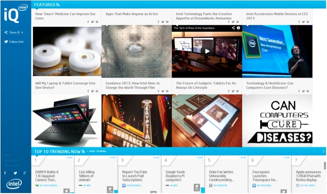 Intel的程序可以快速搜遍大量的社群网站,把发现到的内容,传给网站(iQ)的编辑员工,然后再根据新鲜度、相关性、分享次数、点击次数、员工互动、以及独特性,过滤出在社群网络上最吸引注意的内容。最后,再以色彩鲜艳、迷人、触控优化的接口呈现,让读者可以快速有效地浏览内容。