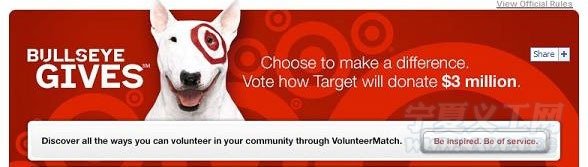 在社会化媒体的公益竞赛中,塔吉特的Bullseye Gives项目提供了300万美元来支持公益活动。超过2 周的投票将决定塔吉特如何捐赠这笔资金。它的Face book社区(现在有超过90万的人加入)将在10个非营利组织中做出决定。