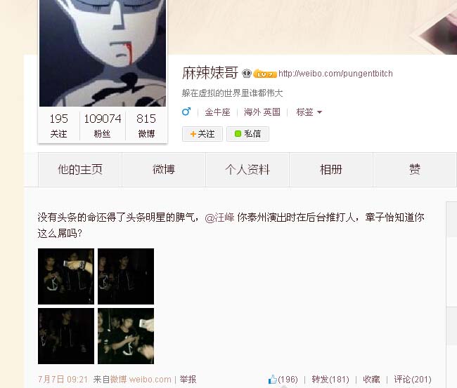 前天(7月7日),微博网友@麻辣婊哥 发布一组图片,并写道:“没有头条的命还得了头条明星的脾气,@汪峰 你泰州演出时在后台推打人,章子怡知道你这么屌吗?”