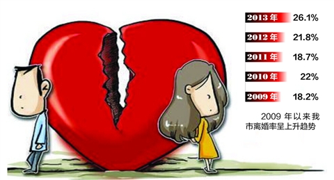 今年上半年苏州婚姻登记统计数字昨天出炉。上半年,我市共办理结婚登记30476对、办理离婚登记8280对, 与去年同期相比,结婚登记减少1910对,离婚登记增加206对。离婚率(离婚人数与结婚人数之比)为27.2%,创我市新纪录。究竟是什么原因造成我市离婚率一路走高?