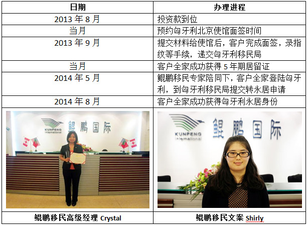2、M先生于2013年9月获得五年居留卡,原本在2014年3月就可以申请转永居身份,但由于M先生掌管大型家族企业,其公司业务非常繁忙,没有时间到使馆面签,转永居的时间推迟到5月份。而且M先生的孩子即将18周岁,面临孩子可能超龄的紧迫,鲲鹏移民专家团队立即制定方案,争取时间的同时还悉心指导客户收集申请材料。鲲鹏移民派专人陪同M先生全家登陆匈牙利,到匈牙利移民局提交转永居申请,并于2014年8月鲲鹏移民再次派专人陪同M先生一家登陆匈牙利,领取匈牙利永居卡。匈牙利采取25万欧元购买国债获取移民身份的方式,投资金额少,风险低,尤其无移民监,且已取消每年登陆一次的要求,这样就更进一步满足了客户只为了拿永居身份,而没时间离开的需求。