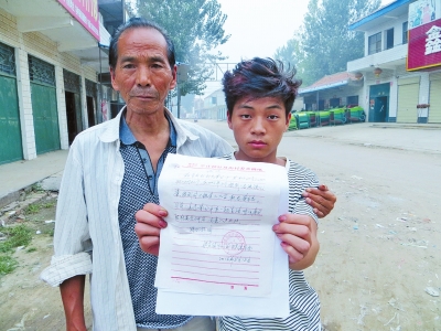 董本杰和他的养父展示村里开具的收养证明 阅读提示|11年前,因一场家庭变故,年幼的他跟随亲戚来到安阳。意外走丢,他开始了流浪生活,直到遇到养父董国申。如今快成年了,他想打工养活自己,却因没有户口和