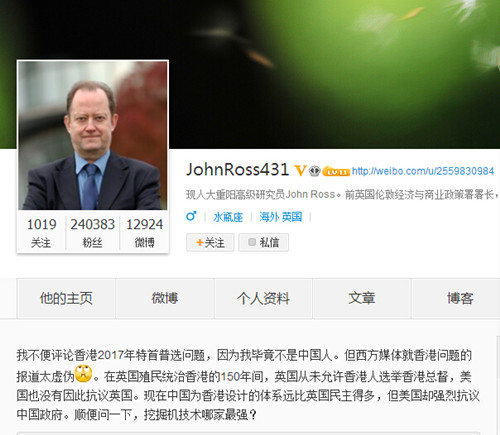 实名认证为“前英国伦敦经济政策署署长,现人大重阳高级研究员”的John Ross 9月29日晚通过新浪微博发声指责,西方媒体涉港报道太虚伪;与美国对此前150年英国统治香港的态度对比,现在美国对中国政府的“强烈抗议”显得没来由。