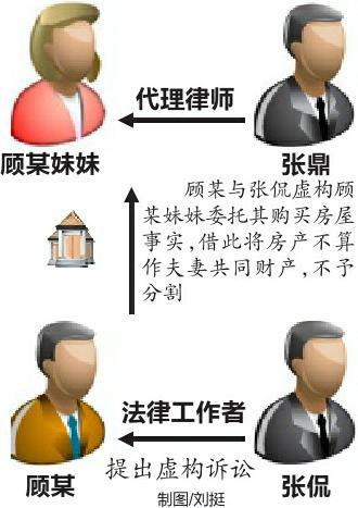 顾某与妻子孙某于1991年结婚。2004年11月,顾某与妹妹分别以各自名义签订购房合同,购买了雁塔区吉祥路同一小区同一幢楼的两套房产。2011年6月,因家庭琐事及子女教育等问题,顾某向法院提起离婚诉讼。诉讼过程中,顾某因不愿将吉祥路的这套房产作为夫妻共同财产进行分割,便找到碑林区“148”法律服务所法律工作者张侃咨询,张侃提出虚假诉讼的方式,虚构顾某妹妹(在国外)曾委托顾某购买该房产的事实,由顾某妹妹起诉顾某归还房产,以达到离婚时该房产不作为夫妻共同财产进行分割的目的。张侃随后找到陕西恒邦律师事务所律师张鼎作为顾某妹妹的代理人,自己作为顾某代理人,二人共同商议虚假诉讼的相关事宜。