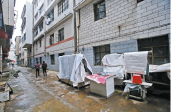 在昆明市洪家营一栋5层高的民房屋檐下,摆着一些柜子和锅碗瓢盆等居家用品,物品上,盖着一块块废弃的喷绘广告布。一个盖了三四层广告布的柜子后,老张睁眼躺在一张木板搭起的简易床铺上。