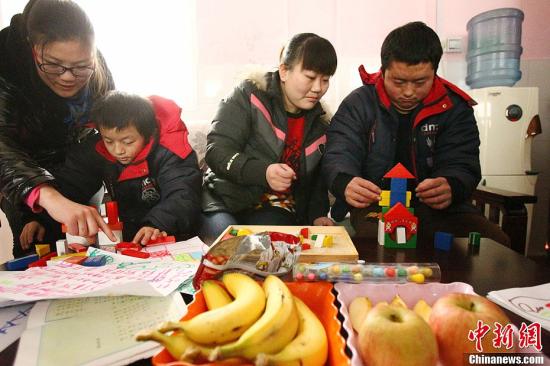 1月7日,河南开封市福利院,被安置在福利院的孩子们在高兴的堆积木、学画画、跟着阿姨们学知识,孩子们住宿的房间里温暖、干净、整齐。图为孩子们在堆积木。中新社发王中举摄